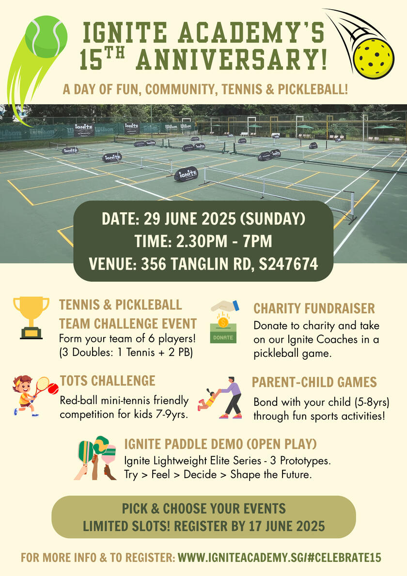 Welcome to Ignite Pickleball!As global interest in pickleball soars, Ignite is thrilled to expand our services to include this engaging sport. Our head coach, Jaime Wong, is passionate to grow this sport in Singapore.She's achieved notable success overseas, including a Gold medal at the China National Team Championships in December 2024, a Gold & Bronze medal at the Pickleball World Ranking tournament in Japan in March 2025, and a Silver and 2 Bronze medals at the GlobalSports Dubai Championships in May 2025, and a Gold and 2 Bronze medals at the PPA Asia Tour in KL in July 2025. Locally, she clinched the PickleSlam 2025 19+ Mix Doubles Gold medal.