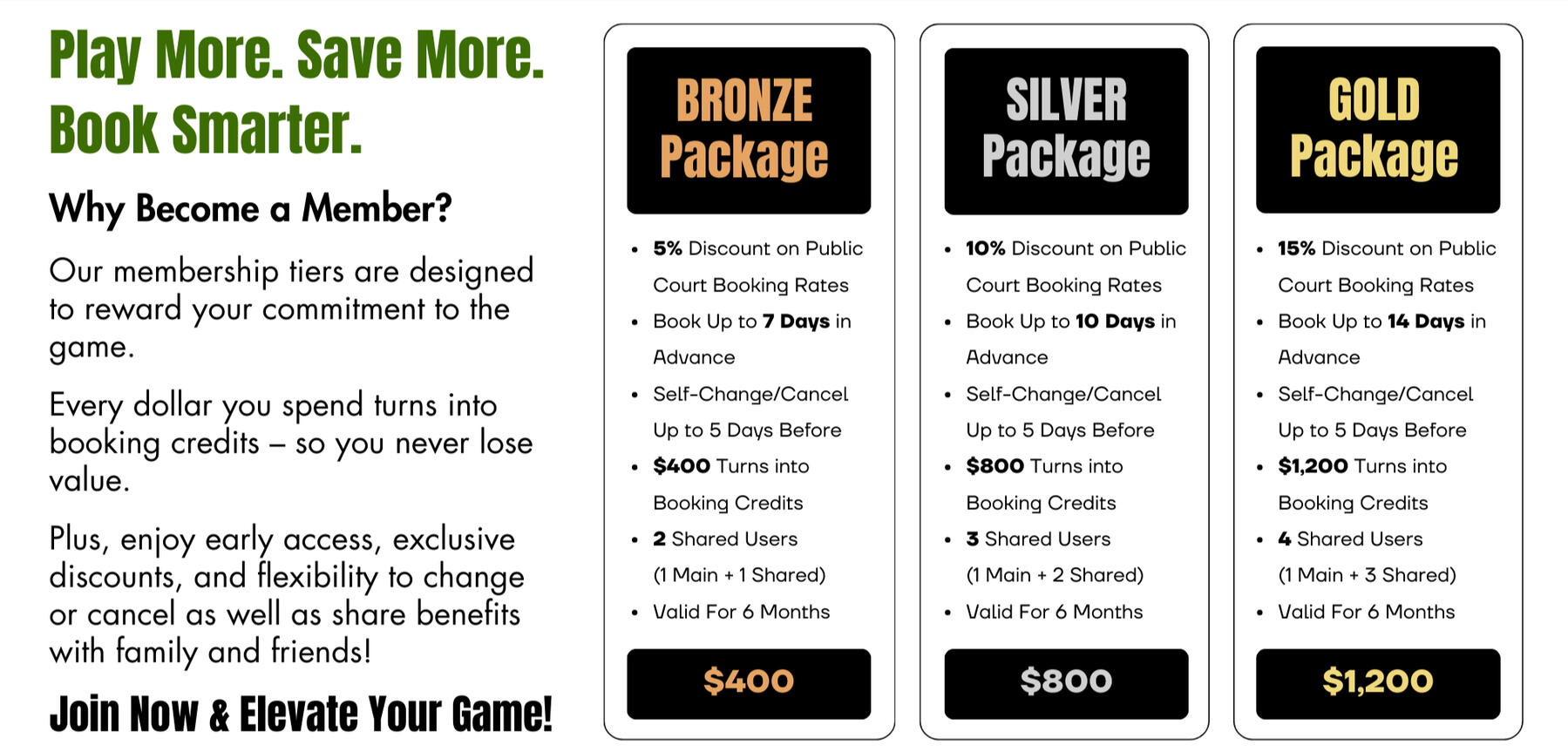 ** Members can book up to 7-14 days in advance and will receive 5-15% discount.